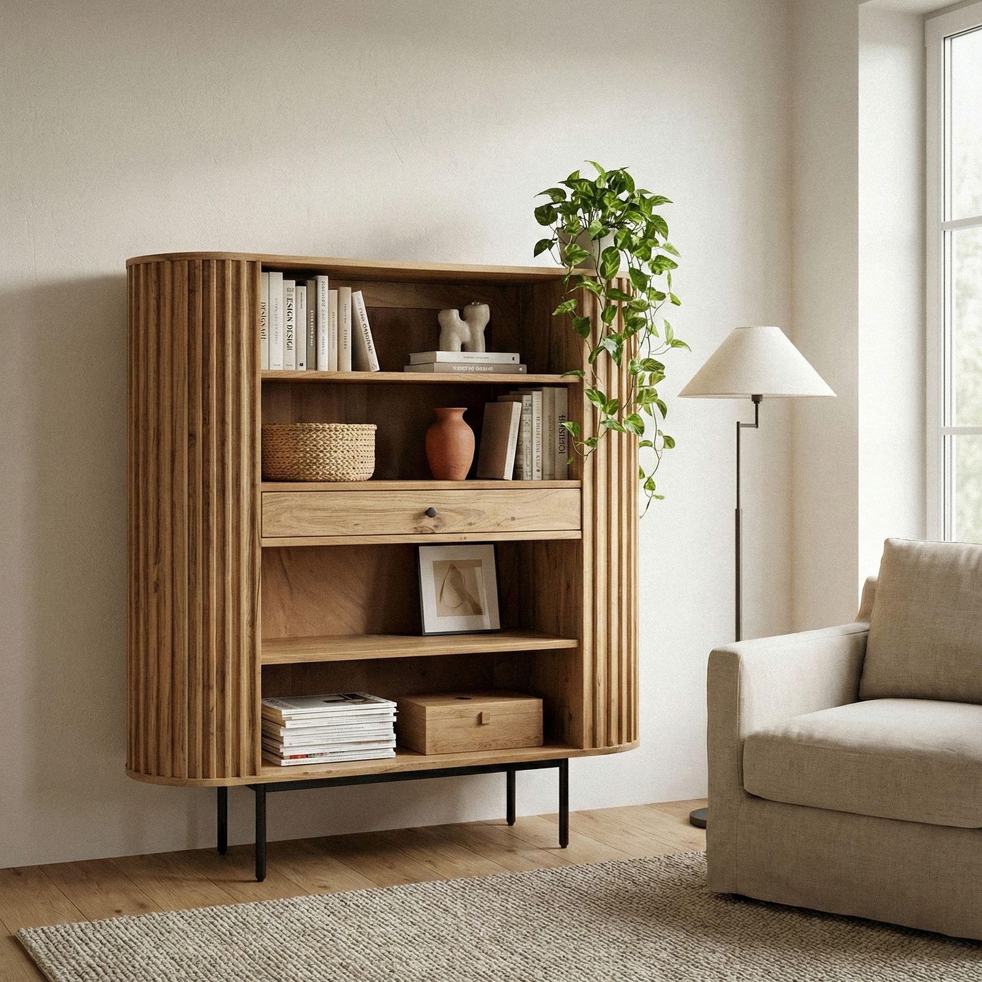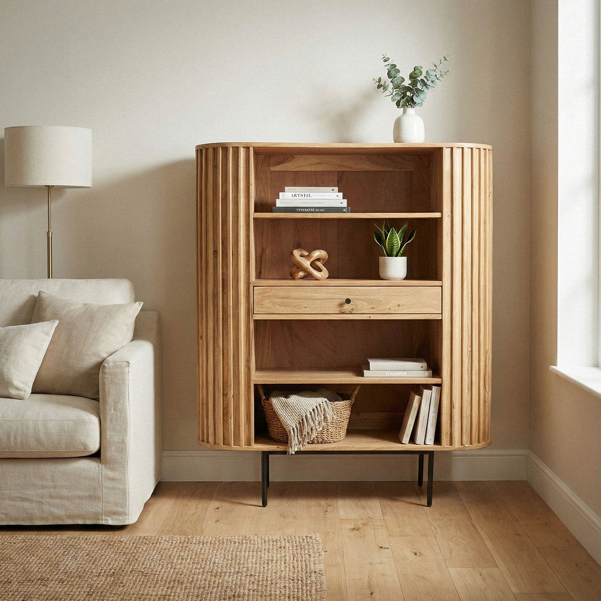 Bücherregal Massivholz Akazie 105×122 cm Lamellen Design – Offenes Standregal mit Schublade – Stauraumregal Metallbeine – Wohnregal Wohnzimmer – Kleiner Schrank Regal Handmade