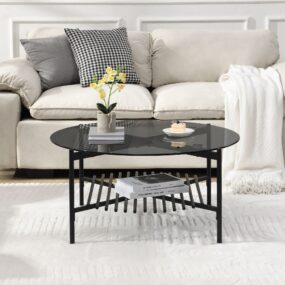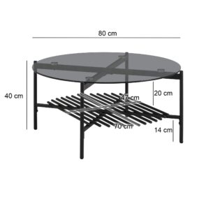 Couchtisch Glas Metall Rund 80×40 cm Schwarz, Moderner Wohnzimmertisch mit Ablage, Sofatisch Wohnzimmer mit Stauraum, Loft Kaffeetisch im Industrial Design