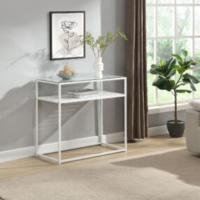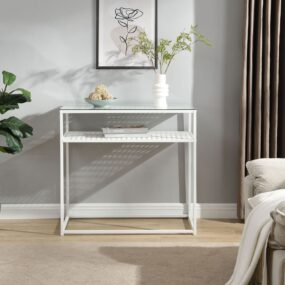 Konsolentisch Glas Metall 80x40x77 cm Flurtisch Weiß Schmal, Ablagetisch Eingangsbereich mit Glasplatte & Metallgestell, Design Glastisch mit Ablage