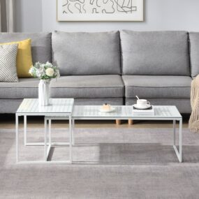 Satztisch Glas Metall 2er Set Modern Couchtisch Weiß, Design Sofatisch Platzsparend, Wohnzimmertisch Kaffeetisch Rechteckig & Quadratisch