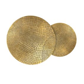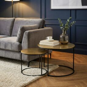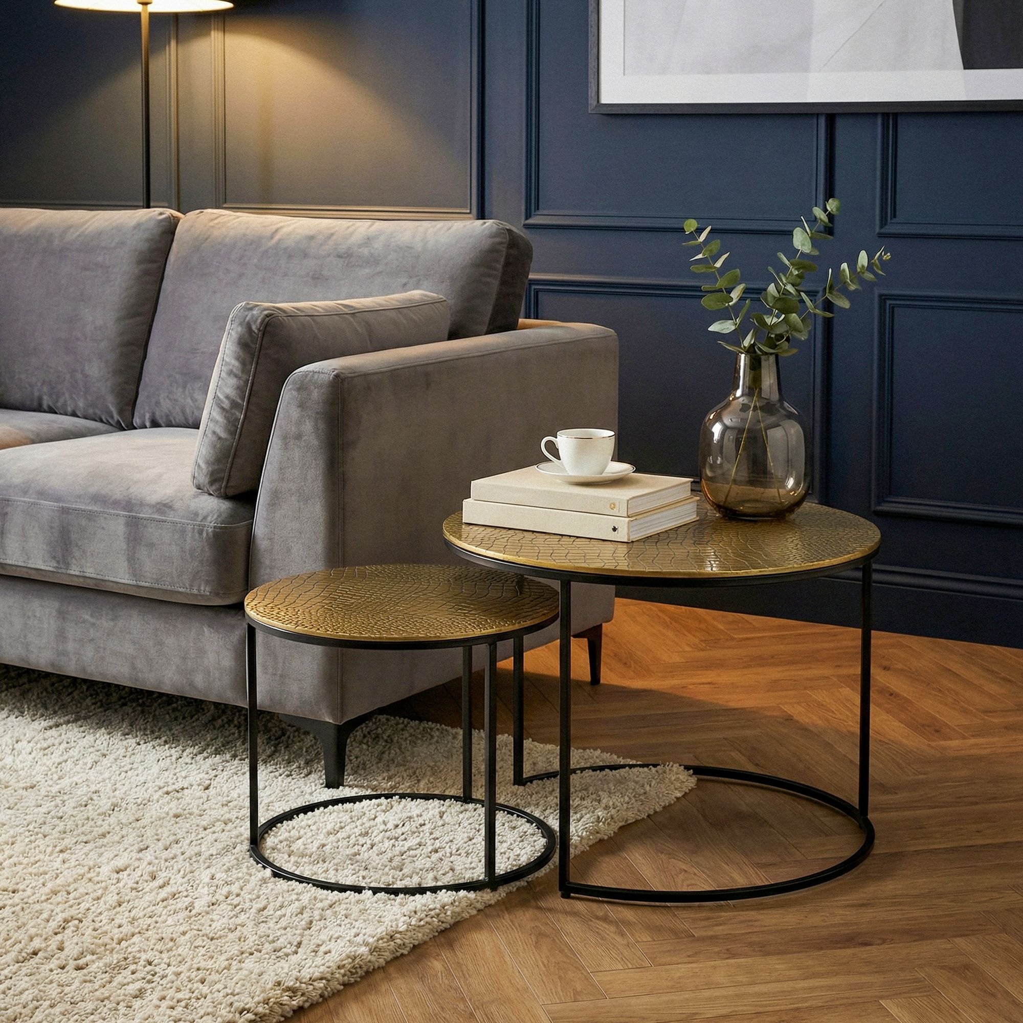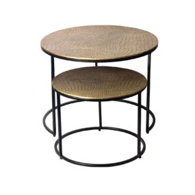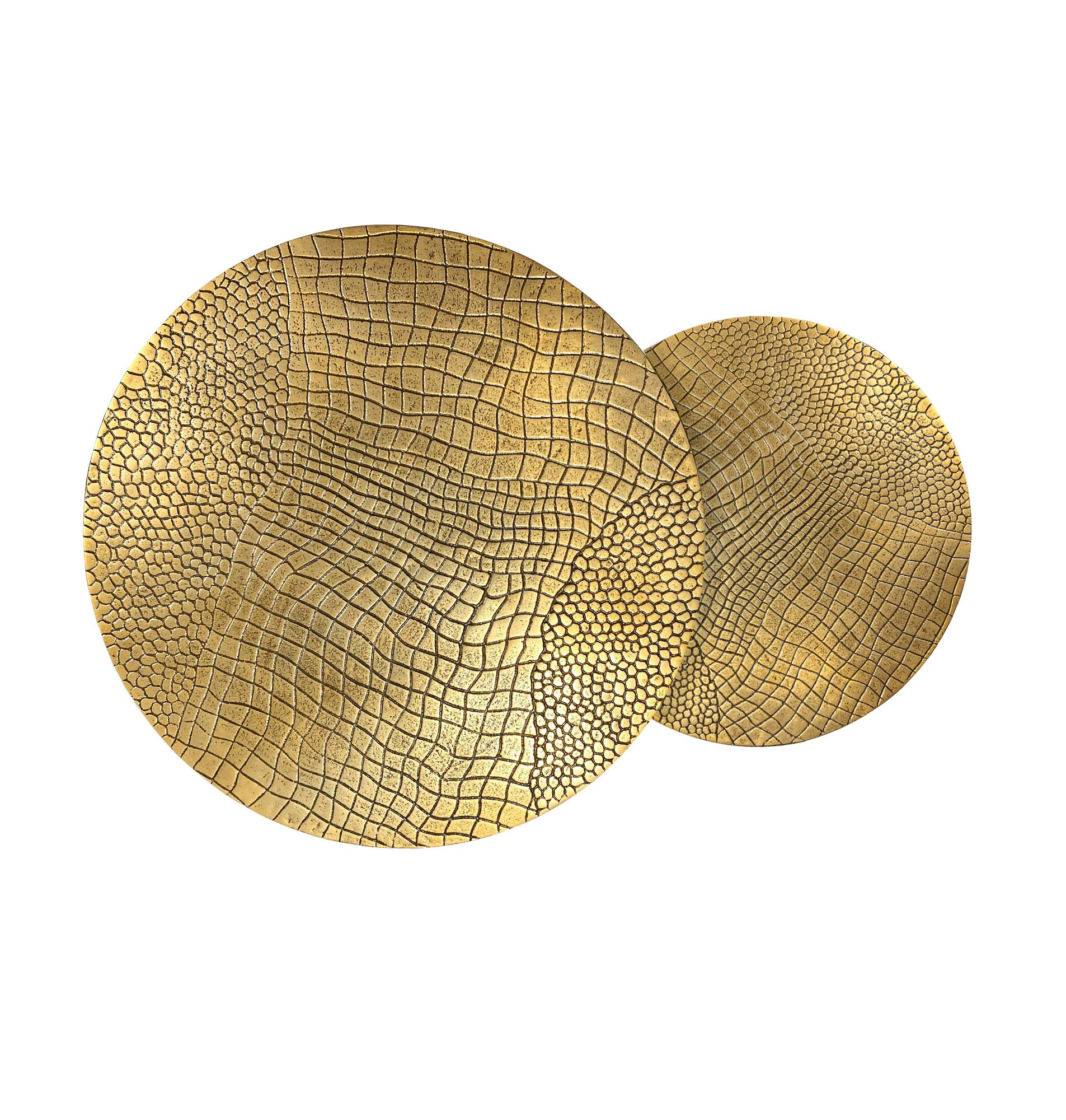 Satztisch Metall 2er Set rund gold – Couchtisch Aluminium Tischplatten mit Muster – Beistelltisch Sofatisch Alu modern – Wohnzimmertisch Eisen Gestell Handmade