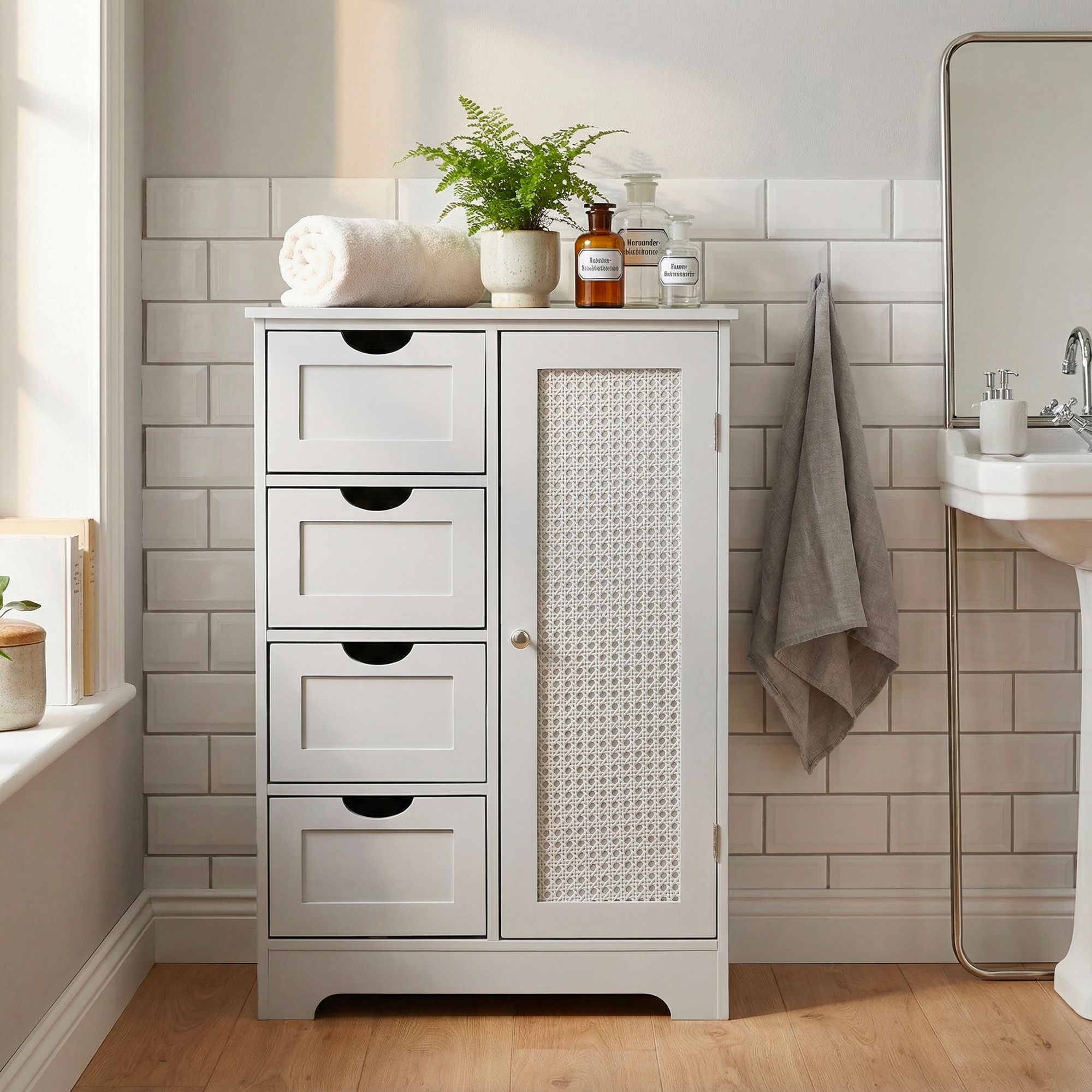 - Vier Schubladen für kleinere Badutensilien wie Kosmetik oder Pflegeprodukte