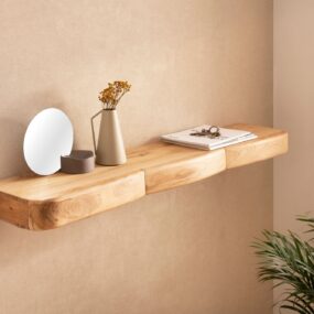 - Keine sichtbaren Halterungen – Holzregal scheint an der Wand zu schweben