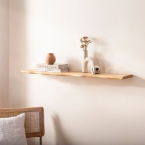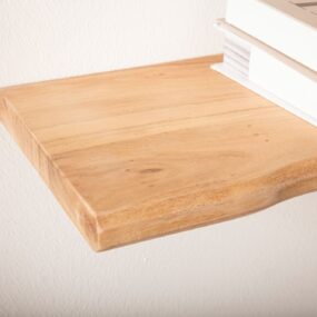 - Keine sichtbaren Halterungen – Holzregal scheint an der Wand zu schweben