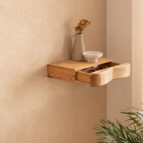- Keine sichtbaren Halterungen – Holzregal scheint an der Wand zu schweben