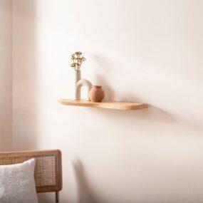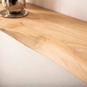 - Keine sichtbaren Halterungen – Holzregal scheint an der Wand zu schweben